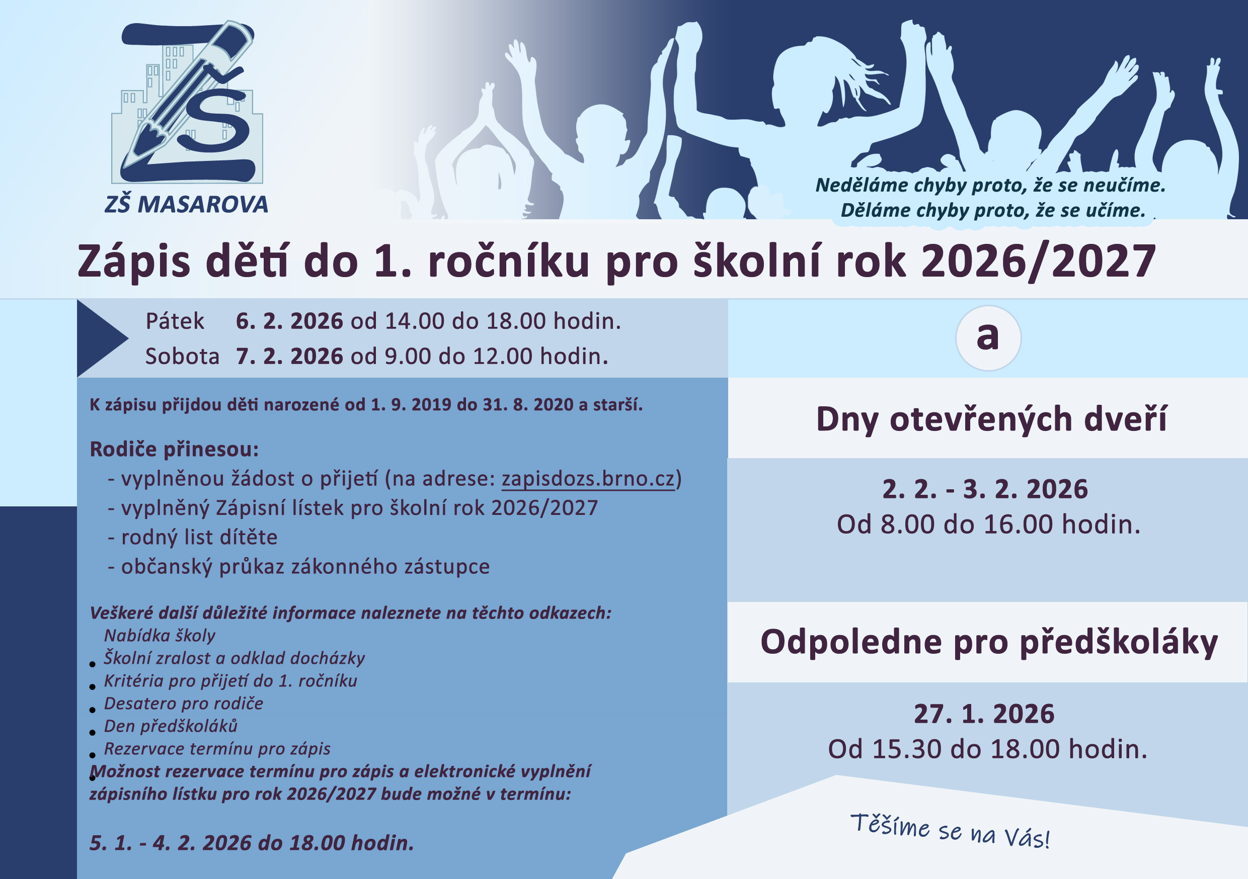 Informace o zápisu do 1. ročníku, pozvánka na Den předškoláků a informace o edukativně stimulačních skupinkách v ZŠ Masarova